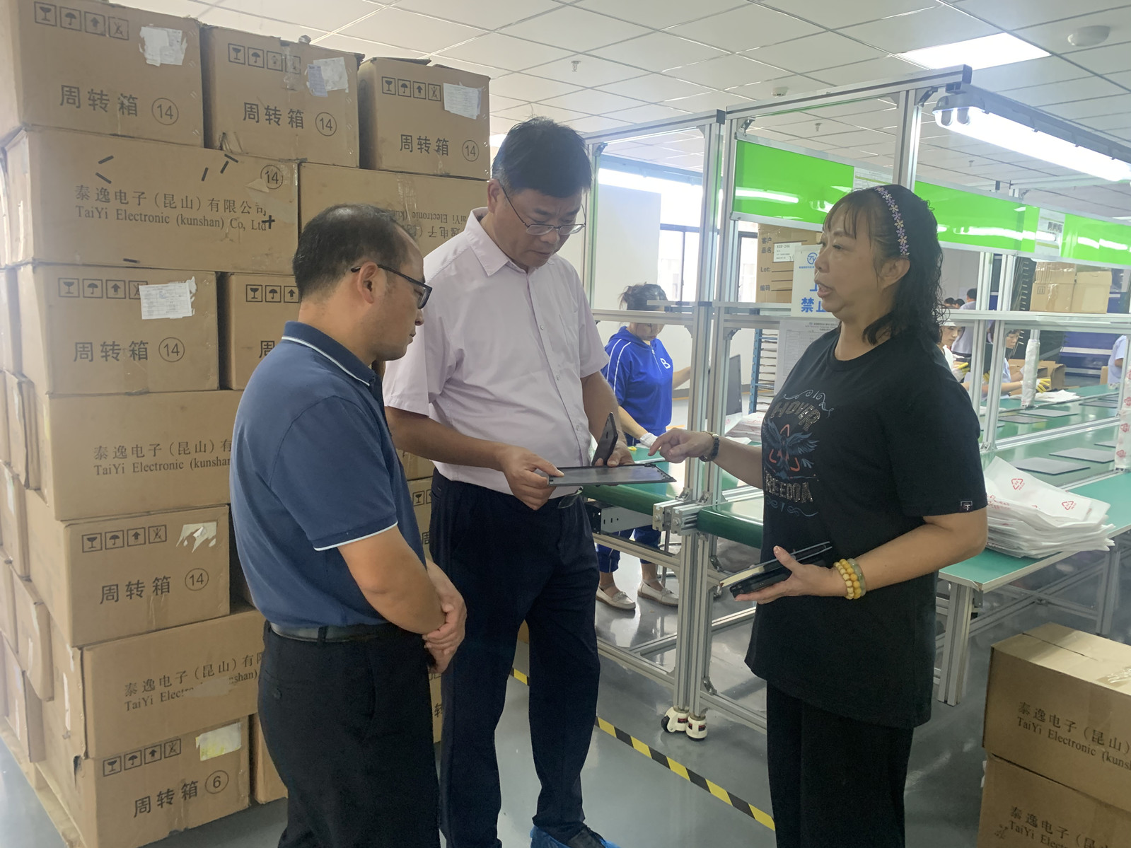 在泰逸生产一线,张素来一行听取企业相关负责人介绍电子产品配件生产过程,泰逸精密科技(滁州)有限公司主要生产和研发电子产品配件、汽车零配件加工,精密冲压模具、模具标准件等产品。
